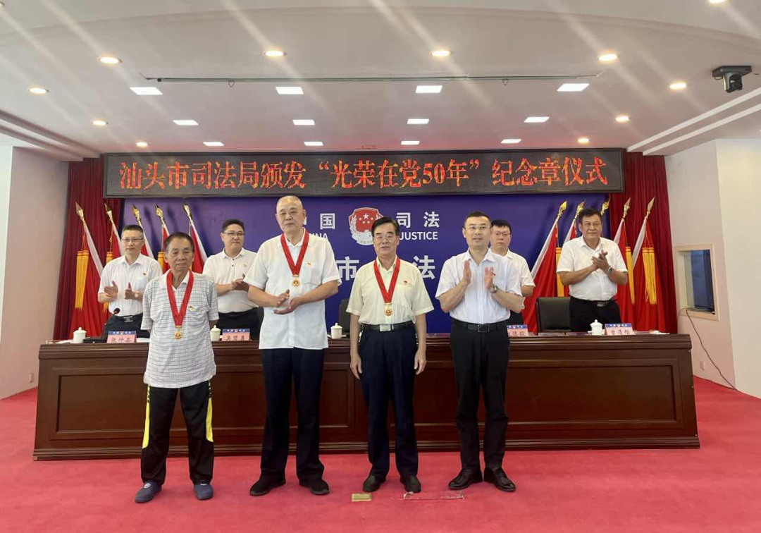 颜世荣同志为陈锡镇、姚德宏、连俊有等3位老党员代表佩戴载满了党的关怀与温暖、承载了荣誉的纪念章,表达对老党员们高尚情怀、奋斗品质、敬业态度和斗争精神的高度肯定,号召全体党员干部学习老党员们退休不褪色、离岗不离党的政治本色和在党言党、在党爱党、在党忧党、在党为党的政治情怀,继承和发扬好汕头司法行政事业的光荣传统,希望老同志们继续发挥好政治优势、经验优势,一如既往地关心支持汕头司法行政工作。