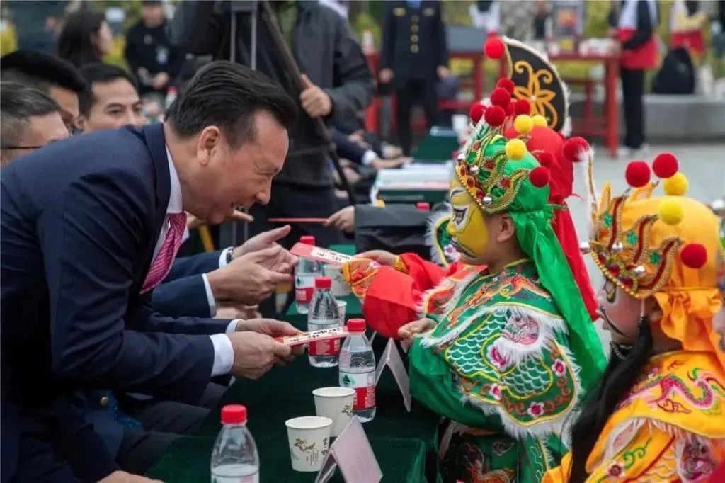 英歌舞小队员现场向在汕华侨代表派送“利是”
