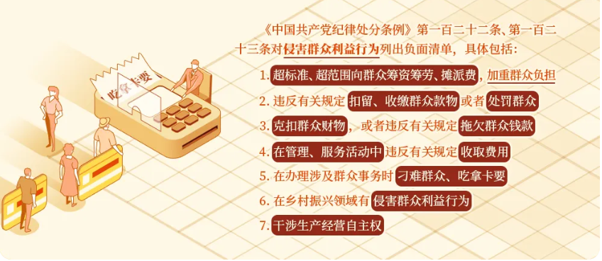 《中国共产党纪律处分条例》第一百二十二条、第一百二十三条对侵害群众利益行为列出负面清单,作出处分规定。这些问题的实质是党员不能正确对待手中的权力,把公共权力异化为管理者的私权,严重损害党和政府的形象,损害党群、干群关系,必须予以禁止。