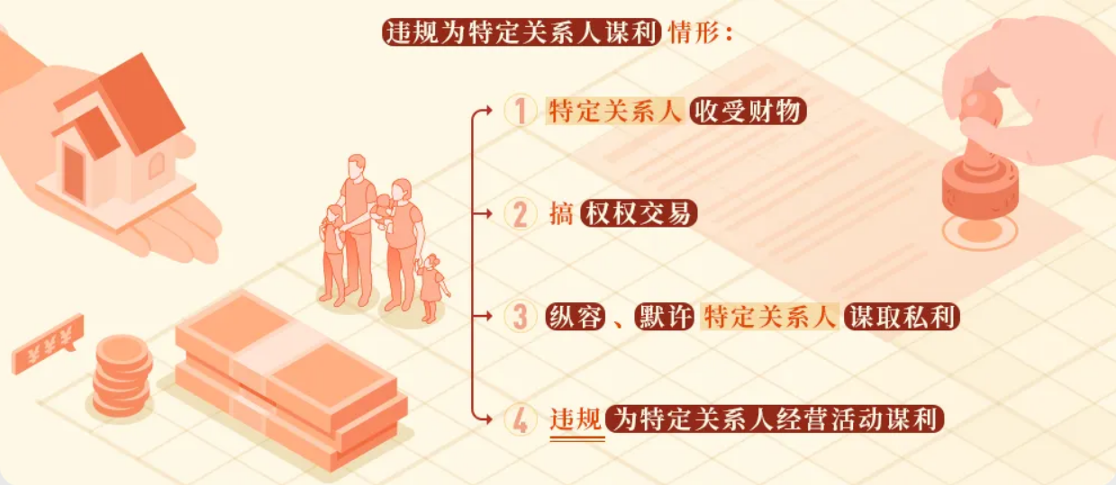 4.违规为特定关系人经营活动谋利。《条例》第一百零四条规定,利用职权或者职务上的影响,为配偶、子女及其配偶等亲属和其他特定关系人在审批监管、资源开发、金融信贷、大宗采购、土地使用权出让、房地产开发、工程招投标以及公共财政收支等方面谋取利益,情节较轻的,给予警告或者严重警告处分;情节较重的,给予撤销党内职务或者留党察看处分;情节严重的,给予开除党籍处分。利用职权或者职务上的影响,为配偶、子女及其配偶等亲属和其他特定关系人吸收存款、推销金融产品、经营名贵特产类特殊资源等提供帮助谋取利益的,依照前款规定处理。