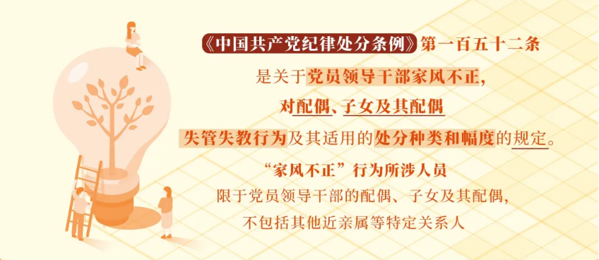 《中国共产党纪律处分条例》第一百五十二条规定:“党员领导干部不重视家风建设,对配偶、子女及其配偶失管失教,造成不良影响或者严重后果的,给予警告或者严重警告处分;情节严重的,给予撤销党内职务处分。”