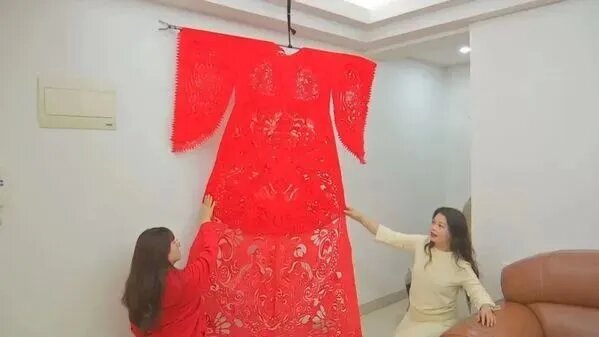 用剪纸剪出一身长达3.7米的火红嫁衣