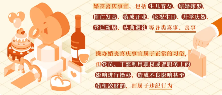 婚丧喜庆事宜本是日常生活中的人之常情,但有些党员利用职权或者职务上的影响大操大办婚丧喜庆事宜,造成了较为恶劣的影响,不但影响正常工作,甚至有的还成为借机敛财的手段。为严格制止这类行为,也是落实中央八项规定精神要求,作出本条规定。