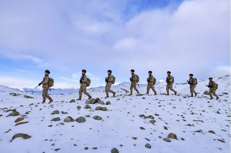 2024年2月9日,驻守帕米尔高原的新疆军区某边防团红其拉甫边防连官兵踏雪巡逻。 新华社发(姬文志 摄)